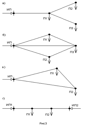 К разомкнутым относят сети, потребители П1-П3 которых могут получать электроэнергию только с одной стороны (рис.3, а). В случае отключения какой- либо линии сети питание потребителей, получающих электроэнергию через эту линию, прекращается.