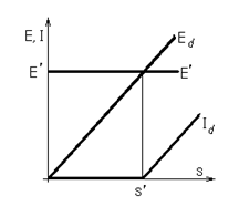 Поскольку Ed=kE1s, а Е1 » U1 = const, то до некоторого скольжения s¢, определяемого уровнем ЭДС машины постоянного тока Е¢ (рис. 4.11,б), ток Id = 0, а следовательно, I2 = 0, и машина М1 не развивает момента. При s>s¢ ток начнет расти в соответствии с приведенным выше уравнением, вызывая увеличение момента (рис. 4.11,в). Мощность возвратится в сеть (рис. 4.11,г); знаки приближенного равенства показывают, что мы не учитываем электрических потерь в сопротивлениях контура выпрямитель - якорь и механических в машинах М2 и М3.