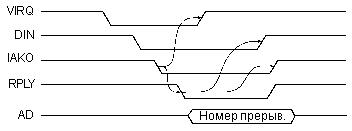 Затем процессор проводит цикл безадресного чтения номера прерывания. В ответ на полученные сигналы -DIN и IAKO устройство, которому предоставлено прерывание, должно выдать на шину адреса/данных AD код номера прерывания (адреса вектора прерывания) и выставить сигнал подтверждения -RPLY. Процессор читает код номера прерывания и заканчивает цикл безадресного чтения снятием сигналов -DIN и IAKO.