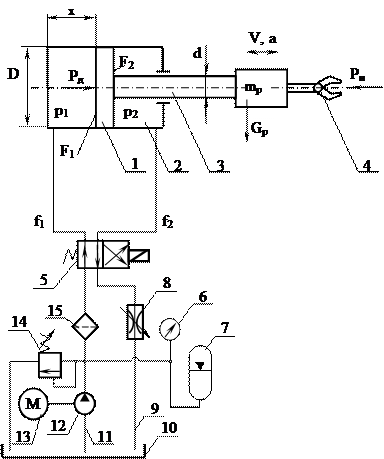 Гидродвигатель ПР содержит поршень 1, цилиндр двустороннего действия 2, шток 3 с рукой и захватным устройством 4. Подача и отвод масла выполняется гидрозолотником 5. В состав гидродвигателя также входят манометр 6, аккумулятор 7, дроссель 8 (регулируется скорость перемещения выходного звена – руки ПР), сливной трубопровод 9 и бак 10, а также заборный трубопровод 11, гидронасос 12, электродвигатель13, предохранительный клапан 14 и фильтр 15.