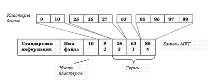 Для сильно фрагментированных файлов требуется много серий и несколько MFT записей. Первая запись о файле содержит список остальных записей. Если этот список велик, то он является нерезидентным атрибутом и размещается в отдельном файле.