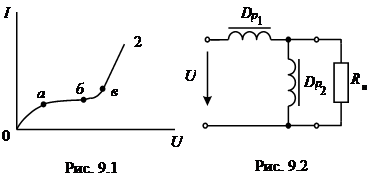 Такие характеристики полезны при расчете цепей из нескольких элементов. Общий вид зависимости для магнитопровода приведен на рис. 9.1. Как и кривая начальной намагниченности, вольт-амперная характеристика имеет начальный участок (оа), линейный (аб), колено (бв) и насыщенная (в, г).