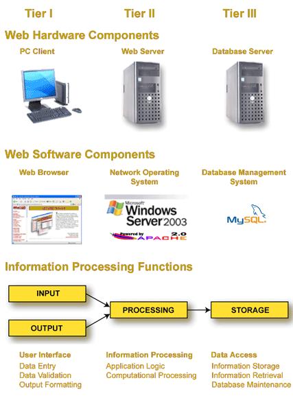 Возвращаясь к понятию трехслойной, клиент/серверной системы, посмотрим, как аппаратные компоненты, программные компоненты, и функции обработки связаны друг с другом с точки зрения обработки информации. Вспомните, что аппаратные компоненты в трехслойной среде состоят из компьютера клиента Web (настольного ПК), компьютера сервера Web, и сервера базы данных. Каждый из этих трех аппаратных компонентов выполняет соответствующее программное обеспечение. Теперь можно отобразить функции обработки информации на эти три слоя оборудования/программ.
