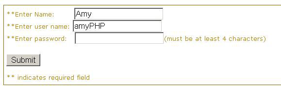 Эта страница формы требует, чтобы пользователь ввел имя, имя учетной записи (имя пользователя) и пароль длиной не менее 4 символов, прежде чем происходит обработка формы. Такой тип проверки формы является важным, так как он помогает гарантировать, что ввод пользователя имеет правильный формат, который можно записать в базу данных, — текстовый файл, используемый для создания сообщения e-mail или для повторного вывода пользователю. Однако один XHTML не может выполнить проверку такого типа. Этот процесс выполняется с помощью перечисленных выше строковых и числовых функций PHP.