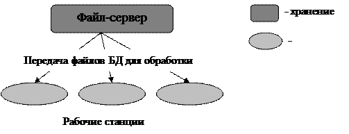Файл-сервер.Архитектура систем БД с сетевым доступом предполагает выделение одной из машин сети в качестве центральной (сервер файлов). На такой машине хранится совместно используемая централизованная БД. Все другие машины сети выполняют функции рабочих станций, с помощью которых поддерживается доступ пользовательской системы к централизованной базе данных. Файлы базы данных в соответствии с пользовательскими запросами передаются на рабочие станции, где в основном и производится обработка. При большой интенсивности доступа к одним и тем же данным производительность информационной системы падает. Пользователи могут создавать также на рабочих станциях локальные БД, которые используются ими монопольно. Концепция файл-сервер условно отображена на рис. 1.