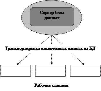 Клиент-сервер. Вэтой концепции подразумевается, что помимо хранения централизованной базы данных центральная машина (сервер базы данных) должна обеспечивать выполнение основного объема обработки данных. Запрос на данные, выдаваемый клиентом (рабочей станцией), порождает поиск и извлечение данных на сервере. Извлеченные данные (но не файлы) транспортируются по сети от сервера к клиенту. Спецификой архитектуры клиент-сервер является использование языка запросов SQL. Концепция клиент-сервер условно изображена на рис. 2.