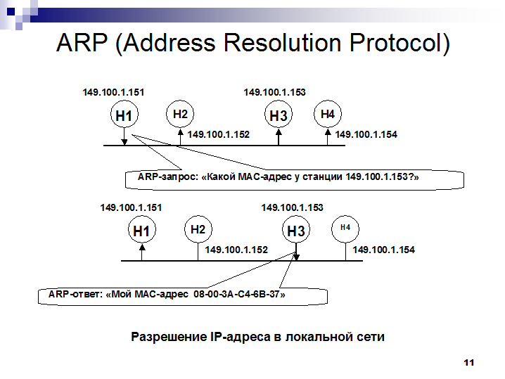 Для доставки IP-пакета к станции назначения, или от одного маршрутизатора к другому, необходимо передать его протоколу канального уровня, например Ethernet. Последний же «умеет» передавать кадры только по физическим адресам устройств, подключенных к среде передачи. В IP-сетях задачу преобразования сетевых адресов в физические решает протокол ARP (Address Resolution Protocol). Идея его функционирования иллюстрируется следующий слайд.