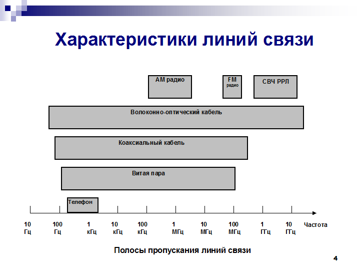 Полоса пропускания зависит от типа линии и ее протяженности. На слайде показаны полосы пропускания линий связи различных типов, а также наиболее часто используемые в технике связи частотные диапазоны.