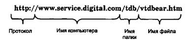 Поиск Web-документа и обращение к нему выполняется по специальному указателю (идентификатору) — URL (Uniform Resource Locator). Стандартный URL состоит их трех частей, определяющих протокол передачи информации, имя компьютера, на котором находится информация, и путь к ней. Например, структура URL компании Vermont Teddy Bears, осуществляющей продажу игрушек, выглядит так: