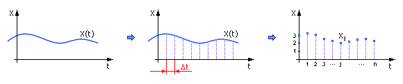 Совокупность значений переменной в таблице, упорядоченных во времени, часто называют динамическим рядом. Естественно, часть информации при такой операции теряется. Чем меньше расстояние между отсчетами, чем больше частота дискретизации, тем меньше потери информации. Частоту дискретизации принимают такой, чтобы не потерять высокочастотные составляющие в сигнале, отдельные пики (см. также «Лекция 08. Модель динамической системы в виде Фурье представления (модель объекта)»).