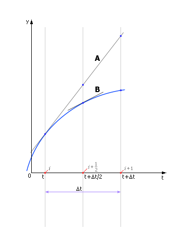 На рис. 14.2 показано, как по значению производной, вычисленной в точке i, делается полшага до точки t + Δt/2 (направление производной показано линией A). И в точке t + Δt/2 вычисляют новую производную. Касательная в точке t + Δt/2 будет другой — линия B. Ее наклон равен производной в точке t + Δt/2.