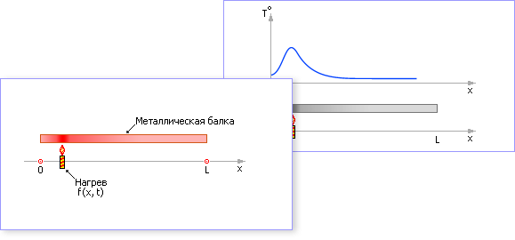 Рис. 19.2. Пример применения уравнения диффузии к описанию процесса нагрева протяженного одномерного тела