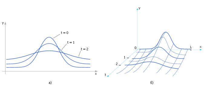 Рис. 19.9. Характерный вид решения уравнения диффузии. На рисунке отражено изменение распределения параметра y вдоль оси x во времени. а) — в двух осях; б) — в трех осях