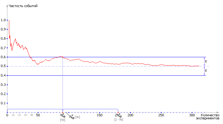 Таким образом, проведя 10 реализаций разной длины, мы определили, что достаточно в среднем было сделать 1 реализацию длиной в 94 броска монеты.