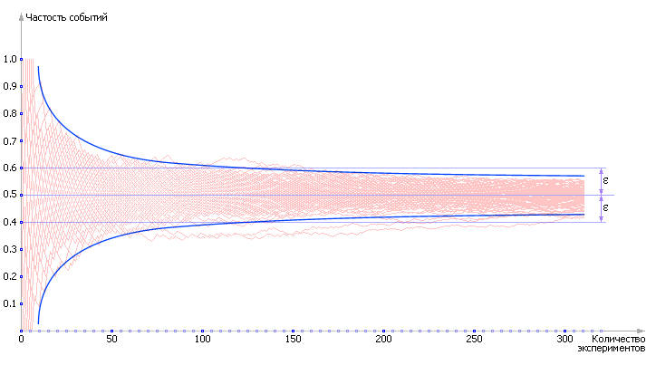 Рис. 21.7. Иллюстрация скорости схождения экспериментально получаемой частости к теоретической вероятности