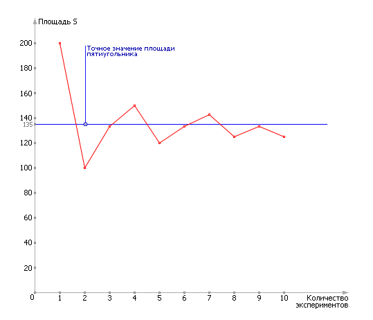 Статистическая гипотеза заключается в том, что количество точек, попавших в контур фигуры, пропорционально площади фигуры: 6:10 = S:200. То есть, по формуле метода Монте-Карло, получаем, что площадь S пятиугольника равна: 200 · 6/10 = 120.