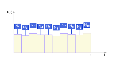 За эталон генератора случайных чисел (ГСЧ) принят такой генератор, который порождает последовательность случайных чисел с равномерным законом распределения в интервале (0; 1). За одно обращение данный генератор возвращает одно случайное число. Если наблюдать такой ГСЧ достаточно длительное время, то окажется, что, например, в каждый из десяти интервалов (0; 0.1), (0.1; 0.2), (0.2; 0.3), …, (0.9; 1) попадет практически одинаковое количество случайных чисел — то есть они будут распределены равномерно по всему интервалу (0; 1). Если изобразить на графике k = 10 интервалов и частоты Ni попаданий в них, то получится экспериментальная кривая плотности распределения случайных чисел (см. рис. 22.2).