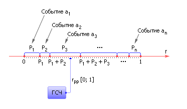 Рис. 23.3. Схема генерации несовместных случайных событий с помощью генератора случайных чисел