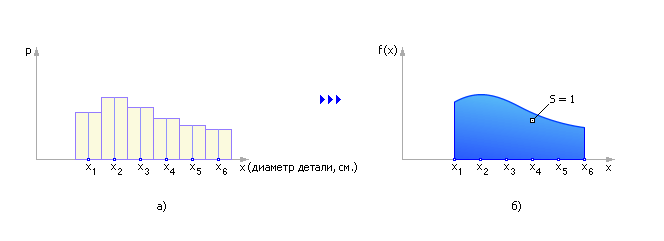 В нашем примере закон распределения вероятности случайной величины показывает насколько вероятно то или иное значение диаметра выпускаемых деталей. Случайной величиной является диаметр детали.