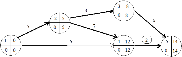 Примечание. Рассмотренная общая схема оптимизации предполагает наличие одного критического пути в сетевой модели. В случае существования нескольких критических путей необходимо либо сокращать общую для них всех работу, либо одновременно сокращать несколько различных работ, принадлежащих различным критическим путям. Возможна комбинация этих двух вариантов. В каждом случае критерием выбора работы или работ для сокращения должен служить минимум затрат на их общее сокращение.