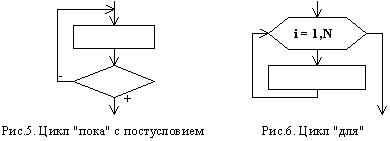 В цикле с постусловием проверка условия выхода из цикла выполняется после очередного действия. Цикл "для" является модификацией цикла "пока" для ситуации, когда заранее известно количество повторений некоторых действий. Запись в блоке заголовка цикла на рис.6 показывает пример описания заголовка цикла, в котором действия повторяются столько раз, сколько целых значений приобретает параметр цикла i от своего начального значения 1 до конечного N с шагом 1. Обычно шаг не указывается, если он равен 1.
