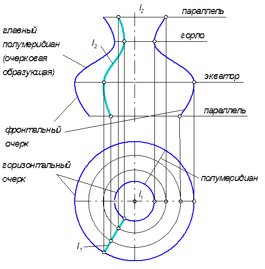 Каждая точка образующей l движется по окружности с центром на оси вращения i. Это окружность называется параллелью. Параллель, проходящая через наиболее удаленную от оси вращения точку образующей, называется экватором, а через ближайшую – горлом.