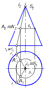 Пусть задана фронтальная проекция точки А, принадлежащей поверхности конуса. Этой проекции соответствуют две горизонтальные проекции точки А1 и А¢1. Их можно определить с помощью образующих поверхности 1-S и 1¢-S или параллели p.