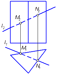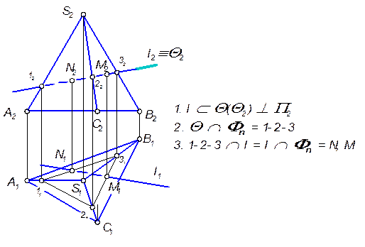 В данном примере призма является горизонтально-проецирующей поверхностью, следовательно, горизонтальные проекции точек пересечения лежат на пересечении горизонтальной проекции прямой l и очерка призмы.