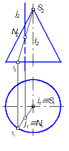 2. Пересекаются проецирующая прямая i с поверхностью конуса F.