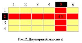 Двумерный массив по расположению ячеек напоминает математическую матрицу ( рис. 2 ). Элемент такого массива характеризуется двумя индексами: первый показывает строку, в которой расположена ячейка, второй – ее столбец.Например, команда d 2, 5 = 43 означает, что в ячейку, размещенную на пересечении 2-й строки и 5-го столбца двумерного массива d, нужно записать константу 43.