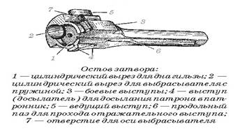 Остов затвора: 1 - цилиндрический вырез для дна гильзы; 2 - цилиндрический вырез для выбрасывателя с пружиной; 3 - боевые выступы; 4 - выступ (досылатель) для досылания патрона в патронник; 5 - ведущий выступ; 6 - продольный паз для прохода отражательного выступа; 7 - отверстие для оси выбрасывателя