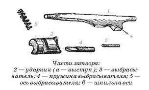 Части затвора: 2 - ударник (а - выступ); 3 - выбрасыватель; 4 - пружина выбрасывателя; 5 - ось выбрасывателя; 6 - шпилька оси