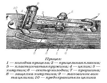 Колодка прицела имеет два сектора для придания прицельной планке определенной высоты и проушину для крепления прицельной планки.