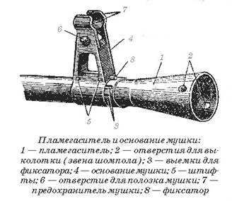 Пламегаситель и основание мушки: 1 - пламегаситель; 2 - отверстия для выколотки (звена шомпола); 3 - выемки для фиксатора; 4 - основание мушки; 5 - штифты; 6 - отверстие для полозка мушки; 7 - предохранитель мушки; 8 – фиксатор