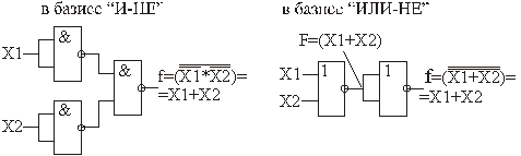 Рис.5.Реализация операции ИЛИ в базисе И-НЕ и ИЛИ-НЕ.