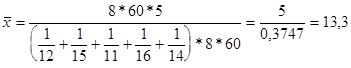 Бригада токарей была занята обточкой одинаковых деталей в течение 8-часового рабочего дня. Первый токарь затратил на одну деталь 12 мин, второй - 15 мин., третий - 11, четвертый - 16 и пятый - 14 мин. Определите среднее время, необходимое на изготовление одной детали.
