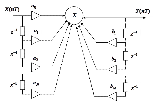 Уравнение, связывающее входные и выходные величины для рекурсивного фильтра, имеет вид: