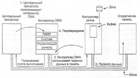 3. Прямой доступ к памяти. Третий метод ввода-вывода информации заключается в использовании специального контроллера прямого доступа к памяти (DMA, Direct Memory Access), который управляет потоком битов между оперативной памятью и некоторыми контроллерами без постоянного вмешательства центрального процессора. Процессор вызывает микросхему DMA, говорит ей, сколько байтов нужно передать, сообщает адреса устройства и памяти, а также направление передачи данных и позволяет дальше действовать ей самой. По завершении работы DMA инициирует прерывание, которое обрабатывается так же, как было описано выше.