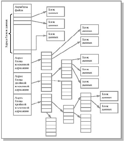Данную схему используют файловые системы Unix (а также файловые системы HPFS, NTFS и др.). Такой подход позволяет при фиксированном, относительно небольшом размере индексного узла поддерживать работу с файлами, размер которых может меняться от нескольких байтов до нескольких гигабайтов. Существенно, что для маленьких файлов используется только прямая адресация, обеспечивающая максимальную производительность.