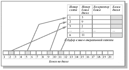 Кэш диска представляет собой буфер в оперативной памяти, содержащий ряд блоков диска (см. рис. 12.12). Если имеется запрос на чтение/запись блока диска, то сначала производится проверка на предмет наличия этого блока в кэше. Если блок в кэше имеется, то запрос удовлетворяется из кэша, в противном случае запрошенный блок считывается в кэш с диска. Сокращение количества дисковых операций оказывается возможным вследствие присущего ОС свойства локальности (о свойстве локальности много говорилось в лекциях, посвященных описанию работы системы управления памятью).
