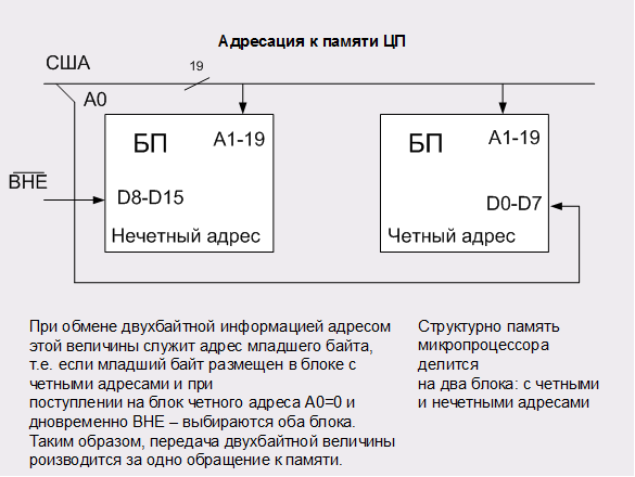 Структурно память микропроцессора делится на два блока: с четными и нечетными адресами, как это показано на рисунке 33.