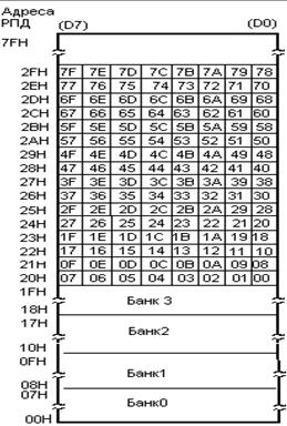 Способы адресации данных. В МК51 используются такие же способы адресации данных, как и в МК48: прямая, непосредственная, косвенная и неявная. Следует отметить, что при косвенном способе адресации РПД в отличие от МК48 используются все восемь бит адресных регистров R0 и R1.