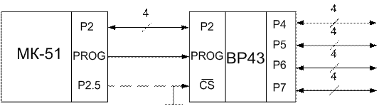 Если сигнал программирования изменяется из высокого в низкий, то на выводах Р2.0÷Р2.3 находятся код управляющего слова (старшие биты) и адрес порта (младшие биты). Если сигнал PROGвысокий,то на выходах находятся данные.
