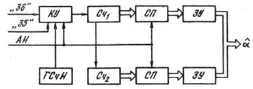 Цифровой измеритель азимута РСБН. Для измерения применяют цифровые устройства (рис. 9.10). Поступающие с декодирующего устройства приемника, импульсы «35» и «36» подаются на контрольное устройство КУ, которое в момент их совпадения устанавливает счетчик Сч1 на нуль и разрешает прохождение на него счетных импульсов от генератора ГСчИ. Счетчик Сч1 подсчитывает число импульсов за время и через каждый интервал времени, соответствующий 10°, выдает импульс на счетчик Сч2. Азимутальный импульс АИ закрывает контрольное устройство КУ и разрешает перепись содержимого счетчиков через схемы переписи СП в запоминающие устройства ЗУ. С этих устройств снимается код азимута, так как при известном периоде счетных импульсов их число является мерой азимута . Счетчик Сч1 выполняет функцию точного измерения азимута, а Сч2 – грубого.
