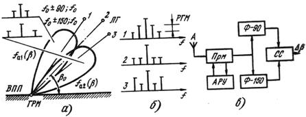 Бортовой приемник ЛА реализует алгоритм (9.29). Для формирования сигналов, пропорциональных и , используется автоматическая регулировка усиления АРУ приемника Прм (рис. 9.14,в) по суммарному сигналу. Фильтры Ф90 и Ф150 выделяют сигналы с частотами модуляции и . В схеме сравнения СС образуется разность этих сигналов, пропорциональная РГМ и несущая информацию об угловом отклонении от линии глиссады.
