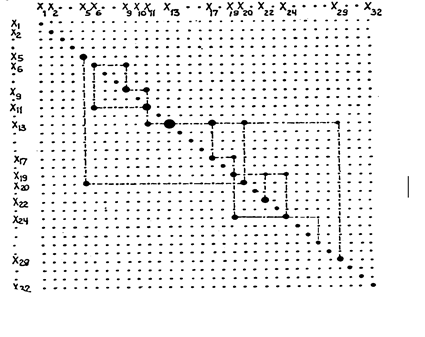 Исходя от максимального диагонального элемента, соответствующего максимальному отклонению от нормы - Dх13 в наблюдаемом множестве параметров состояния системы, следует перемещение по строке (рис.1.7) с выявлением причин, вызвавших отклонение данного параметра, и выбором наиболее значимой. Далее следует переход по столбцу к новому элементу главной диагонали, после чего вновь оцениваются элементы соответствующей строки. Поиск продолжается до нахождения отклонения, в строке которого все недиагональные элементы будут равны нулю, например . Это означает, что данное отклонение является одной из основных исходных причин возникновения аномальной ситуации.
