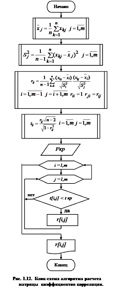 Алгоритм формирования корреляционной матрицы rij (рис.1.12) включает создание файла результатов наблюдений и последовательную обработку каждой пары столбцов. Полученная в результате симметричная матрица дополняется единичной главной диагональю и корректируется с учетом фактически существующих связей в системе.