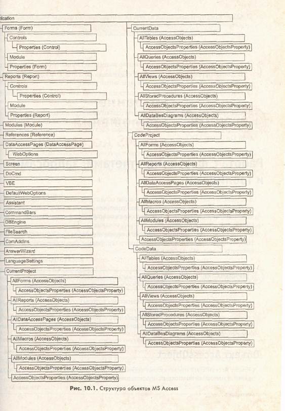 На рис. 10.1 приведена структура объектов MS Access. MS Access имеет структуру объектов несколько отличную от структуры ранее рассмотренных приложений MS Office 2000. Например, в MS Access нет такого объекта, как Selection, который имеют все ранее рассмотренные приложения. Еще одним важным отличием является то, что в MS Access для организации интерфейса пользователя используются собственные формы и элементы управления, а не формы, содержащиеся в библиотеке объектов MS Forms. Очевидно, что эти особенности связаны с назначением приложения и его функциональными возможностями.