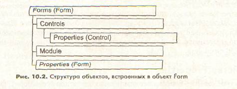 Ранее мы уже говорили, что формы в MS Access не соответствуют формам, используемым в MS Word и MS Excel. Так, в структуре объектов MS Access присутствуют объекты Form и Control, которые позволяют работать соответственно с формами и элементами управления. В MS Word и MS Excel для этих целей используются объекты UserForm и Control, содержащиеся в библиотеке Microsoft Forms 2.0.