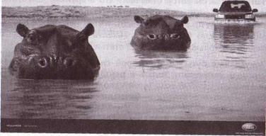 Отмечены наградой Британской академии дизайна D&AD Awards и Каннским фестивалем (2002) постеры с рекламой «Land Rover Freelander», выглядывающего из воды в окружении группы гиппопотамов (илл. 3.18). Но впервые внедорожник в компании бегемота был изображен в рекламе «Toyota Hilux 4x4 (2000)».